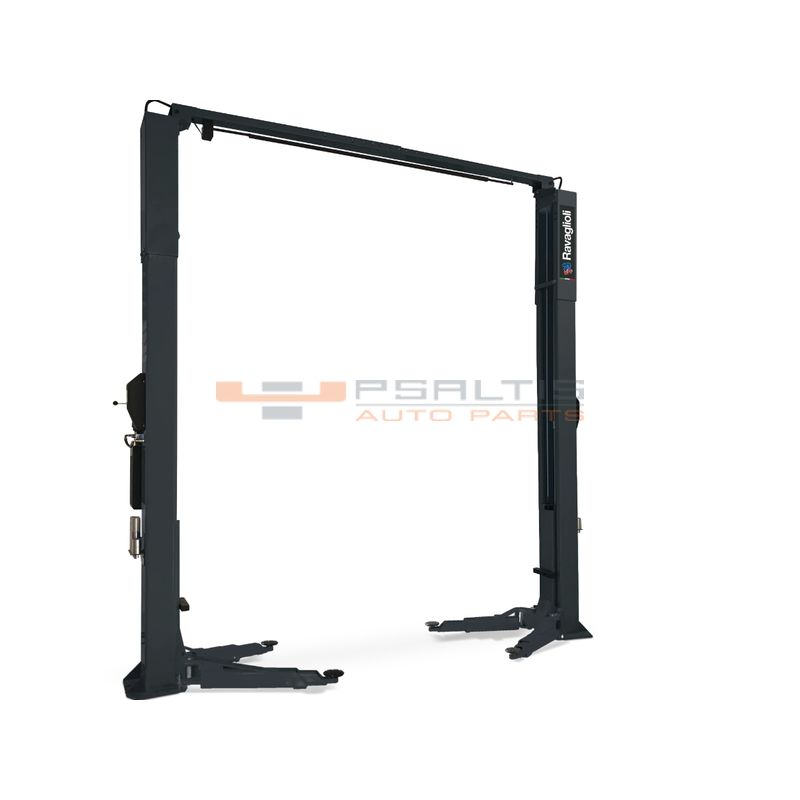 Electrohydraulic 2-post lift without base, with asymmetric arms and symmetric posts that enable an easy access to the pick-up points of the vehicle.